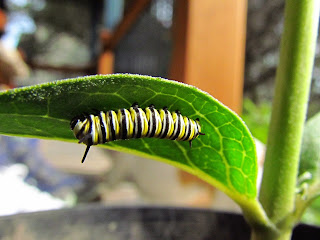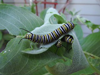 They are mostly the ones that I raised in my kitchen window on plants.  I cultivated these plants to give away and increase the population of milkweed in the area.  They have eaten most of the leaves off of these young plants so I moved the caterpillars outdoors to the milkweed patch.  They are getting so big!   They move up and down the five foot tall plants with ease.  Any day they should be moving on to the next big adventure in their young lives.