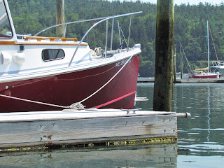 On most Mondays, the Plein Air Painters of Mount Desert Island, Maine, meet at different locations around the island.  On Sunday evening, local artist and author Gail, sends out a email with the painting location for the next morning.  Last year was my first year of joining the group and I had the pleasure of doing so again this year.  We met at the Northeast Harbor Marina.  That meant boats, boats, more boats and water; both of which I am not very familiar at painting coming from the high desert of Central Oregon.  First I did a warm-up in my watercolor journal.  I pick a smart looking red boat to paint.  This was fun, small and spontaneous.  Then I attempted a 1/4 sheet watercolor painting.  By the time I started, I had less than an hour to finish before the group stopped painting for critique and picnic lunch.  So I did not get very far with my larger painting as I felt it was important to get the shape of the boat somewhat correct.  I will share with you my journal entry: