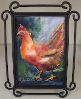 I have been having fun painting miniature paintings of my chickens giving them lots of color and life. These paintings will be available for purchase starting on Friday for the First Friday Art Walk at the Birkenstock store and the Red Chair Gallery, December 4, 2010. Hope you will come in and let me know what you think.